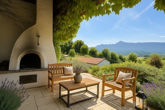 Die große Südterrasse mit überdachtem Freisitz und offenem Kamin, laden ein den spektakulären unverbaubaren Bergblick das ganz Jahr über zu genießen.