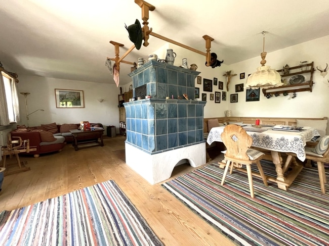 Das Erdgeschoss teilt sich auf in einen Windfang mit Gäste WC und Diele, eine Essküche und einen großen Wohnraum mit herrlichem Kachelofen und massiven Dielenböden.